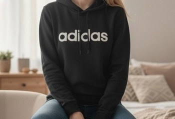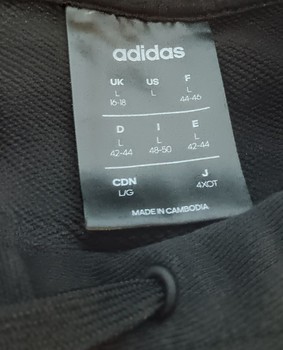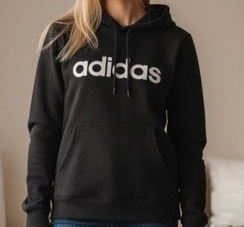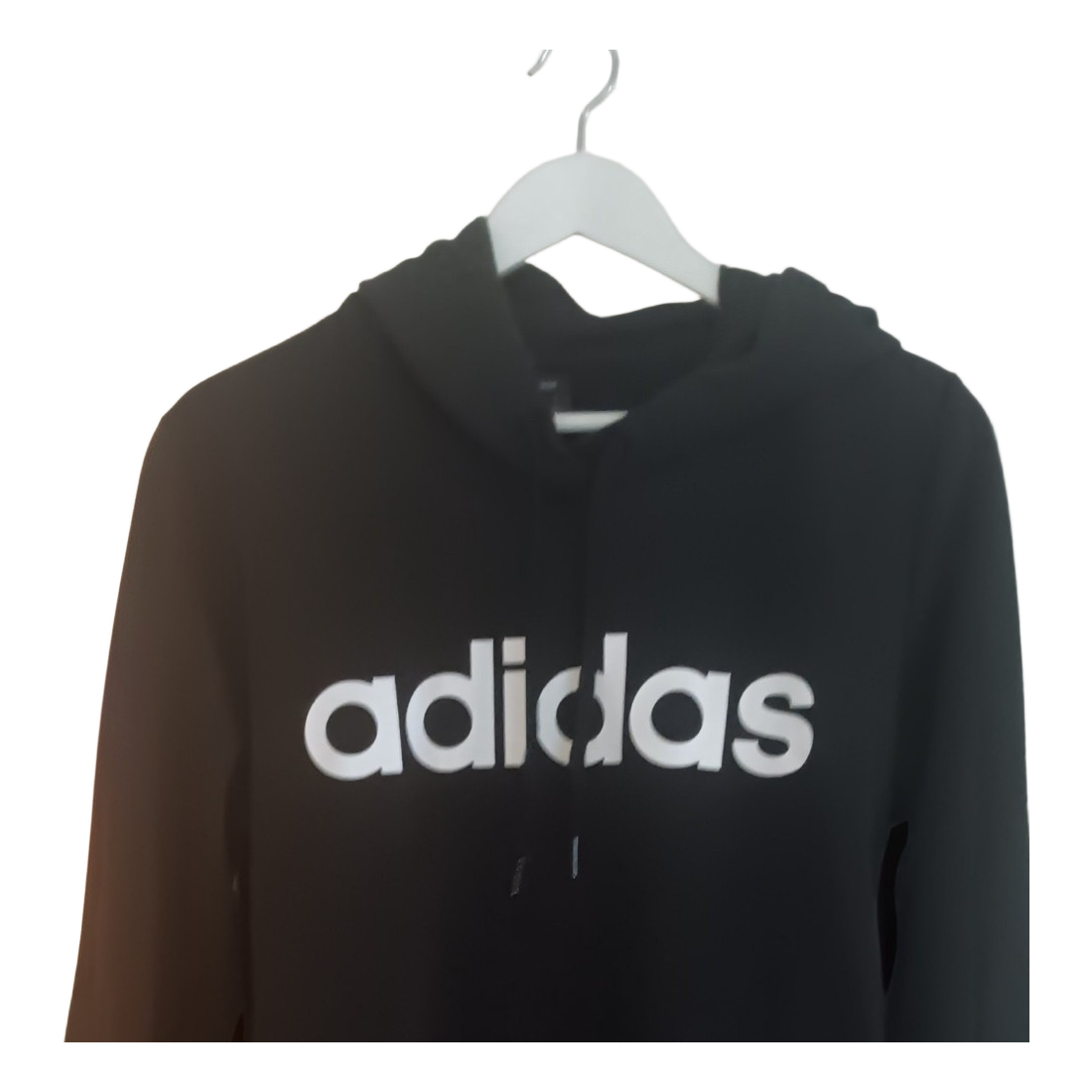 Black Adidas hoodie, with white text on the front. Size L, corresponds to size M. Made of cotton and polyester.