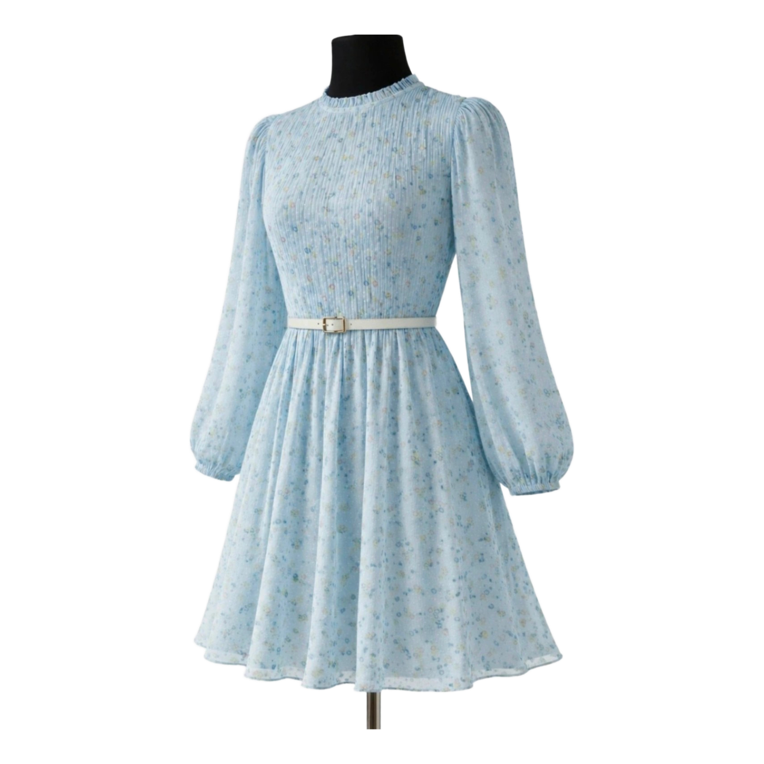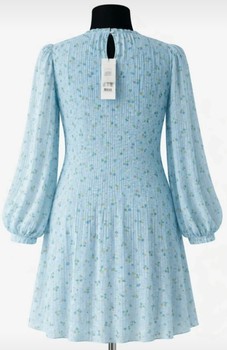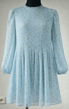Floral print midi dress with a high neckline and long sleeves. Textured fabric with a pleated effect.