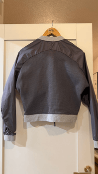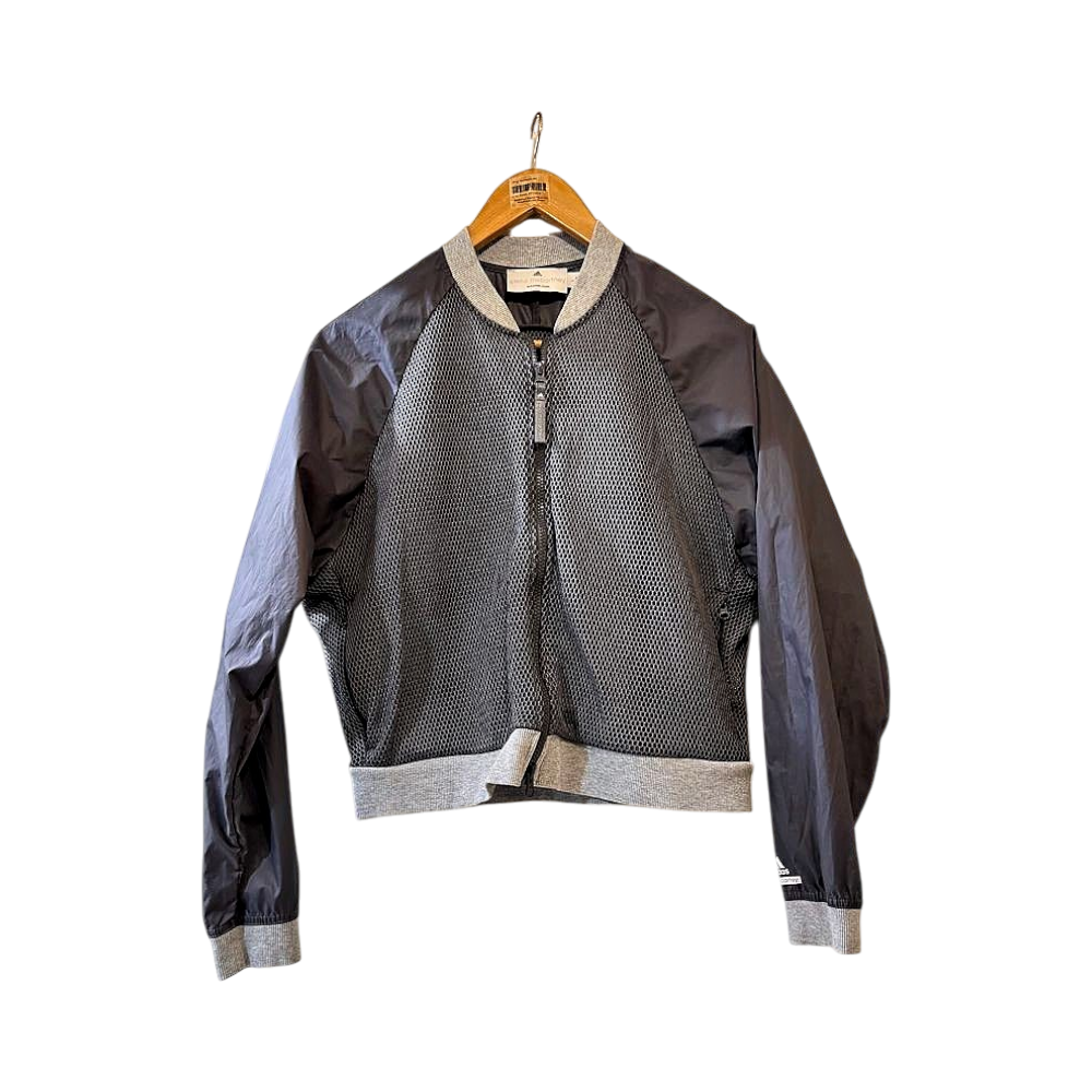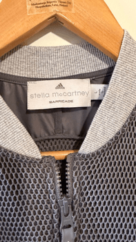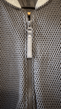 Gray mesh jacket, which is short on the body. On the sides zippered pockets and elastic cuffs.