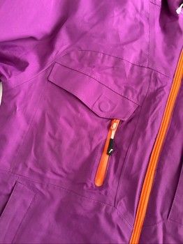 Sleeve ends have Velcro fastenings. Left sleeve has a zip pocket for a ski pass. Jacket hem and hood have drawcords. Inside the jacket hem there is a snap-on snow guard. Inside the jacket on both sides are mesh storage pockets. Overall the jacket has very good storage space.
