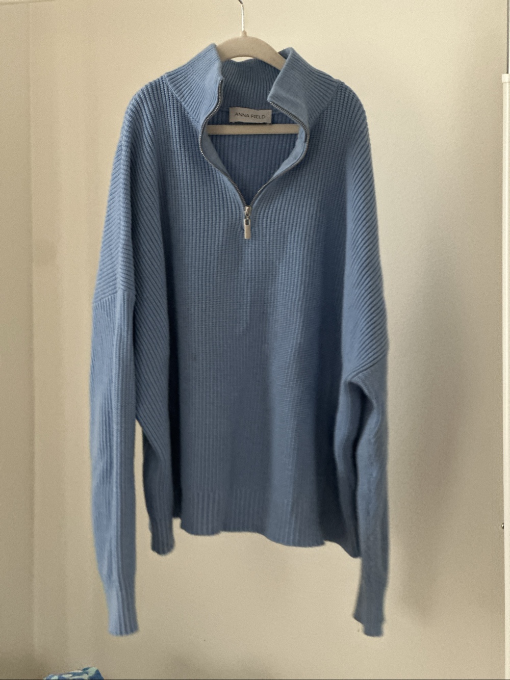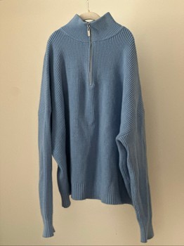 Light blue knit sweater, size L. The item is actually like new, the picture does not flatter it. Very neat, does not pill, I used it a couple of times, did not fit because of weight.