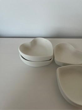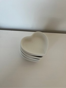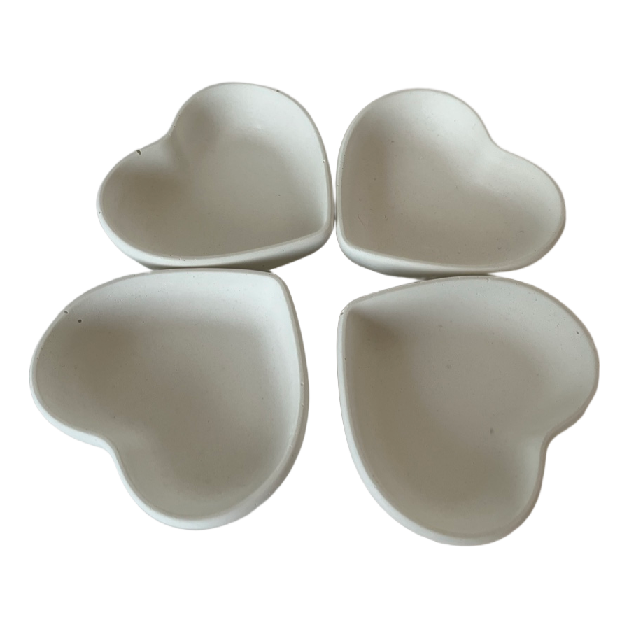 Four white heart-shaped bowls made of concrete. Suitable for jewellery.