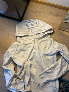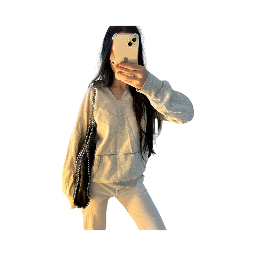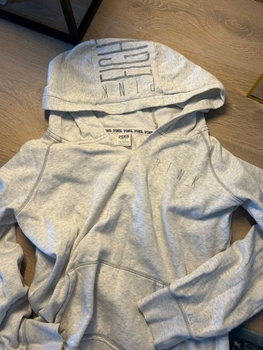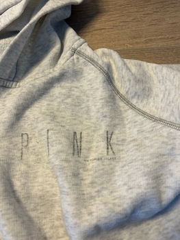 Grey Victoria's Secret PINK hoodie with embroidered PINK logo on the front and on the hood. The hoodie has a kangaroo pocket and a V-neck opening. Size L.