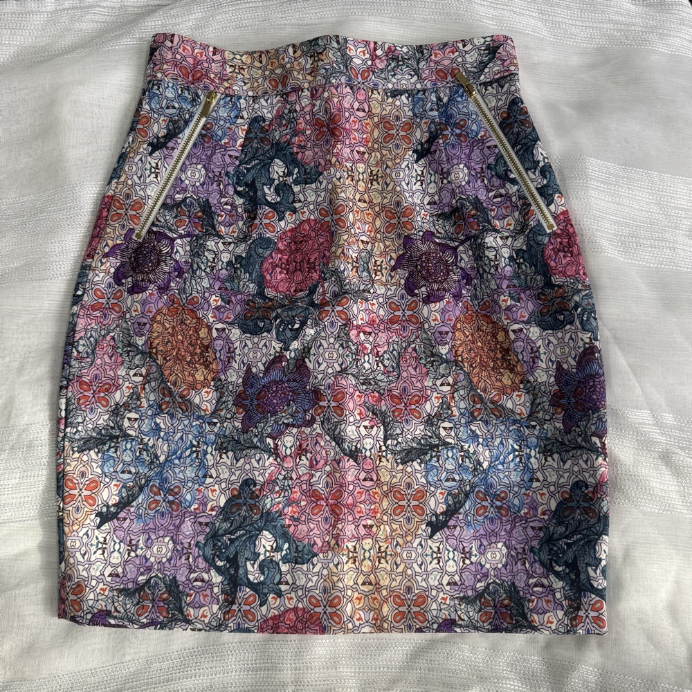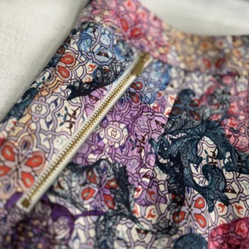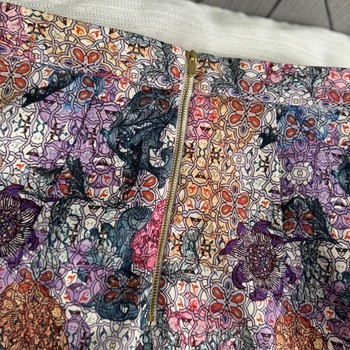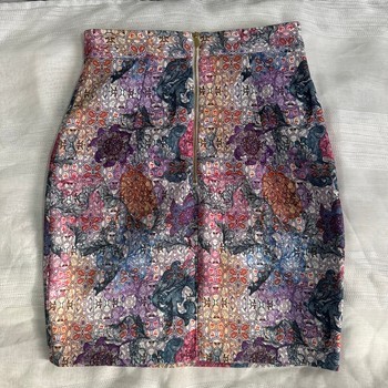 Svārki ar krāsainu rakstu un rāvējslēdzēja detaļām. Izmērs 36.