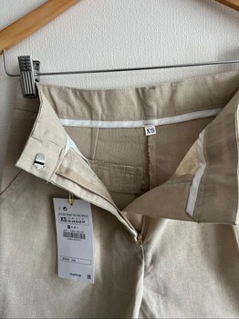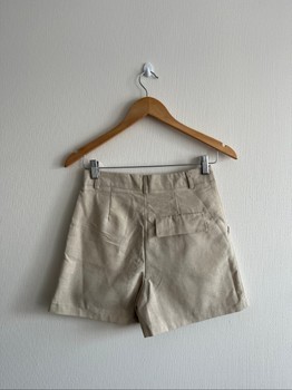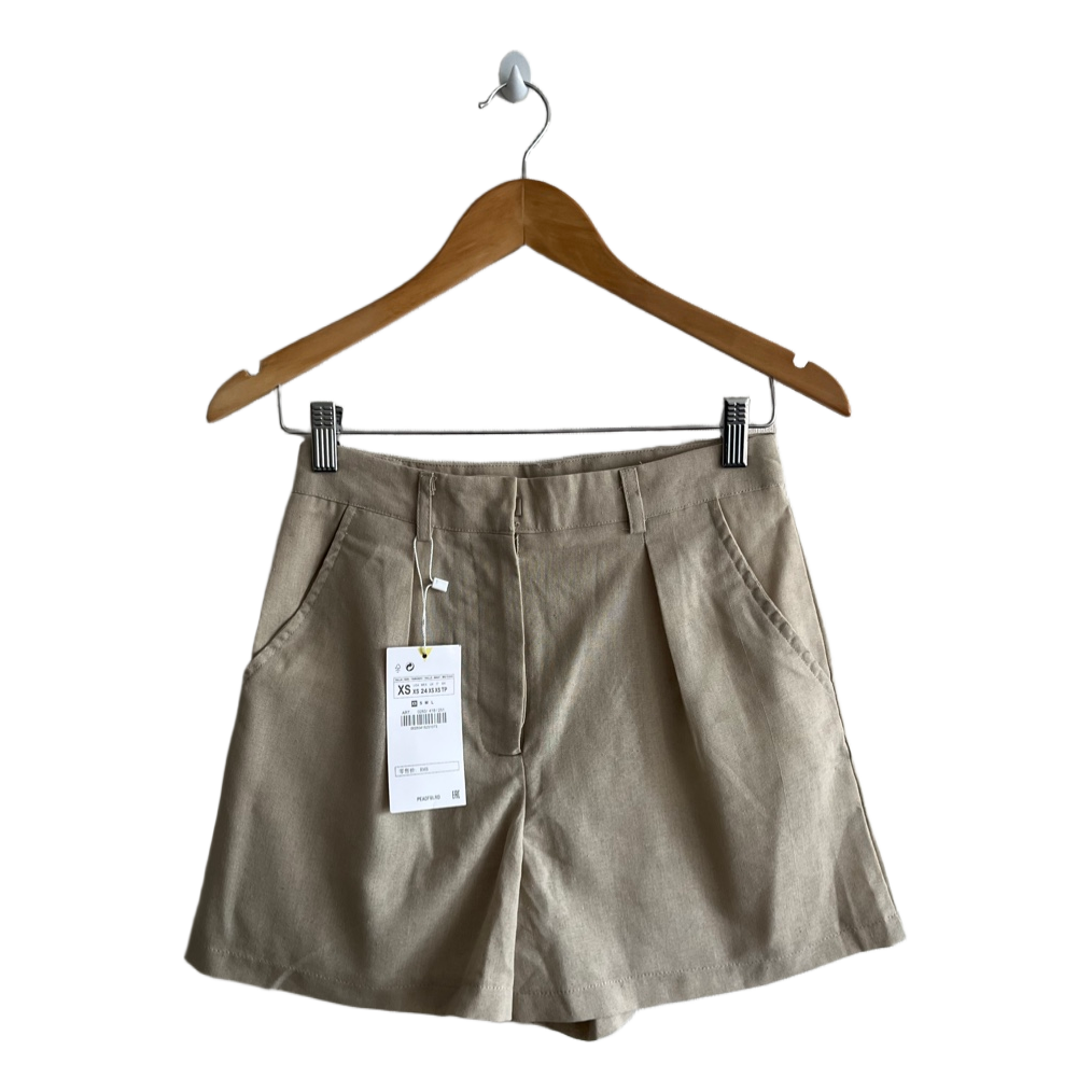 Tailored shorts in a beige color. Features a hook and zip closure and back pocket detail. New with tags, size XS.