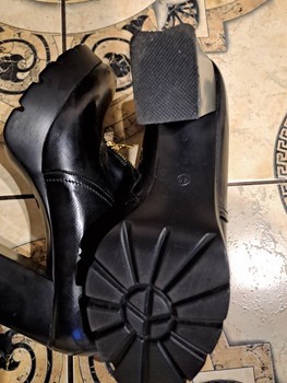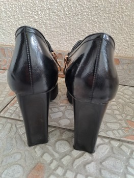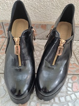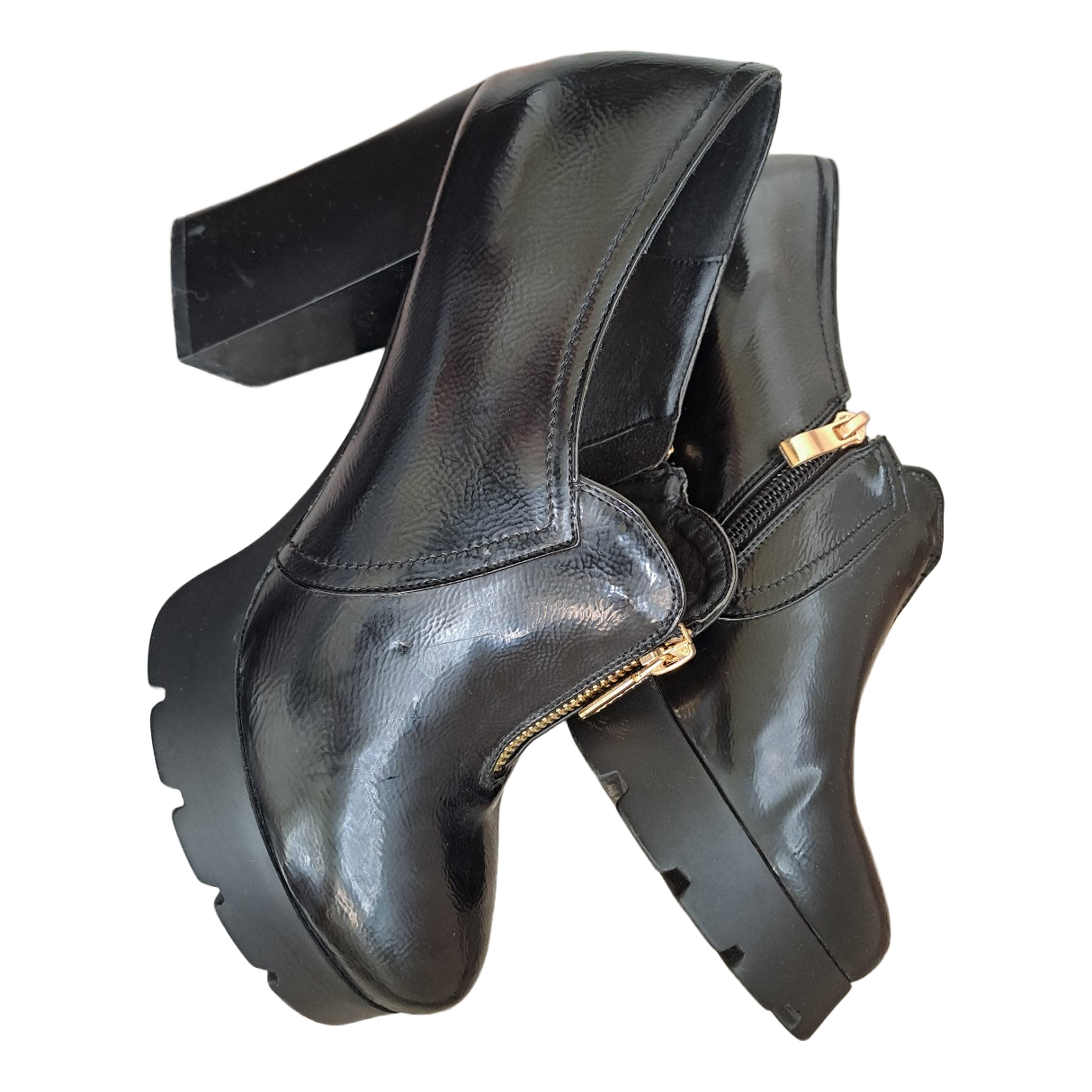 Black patent ankle boots with gold-tone front zippers and thick block heels. Lug sole base. Size 40.