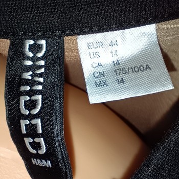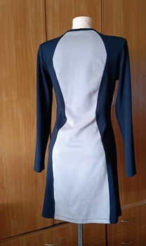 Two-tone long-sleeved dress with black sides and a ribbed brown centre panel. The real colour you may see in the last photo. Size indicated XXL, but I would say smaller, more like L or XL. Before buying, consider the given measurements. Total length 89 cm. Across armpits without stretching 45 cm. Sleeve from armpit 44 cm.