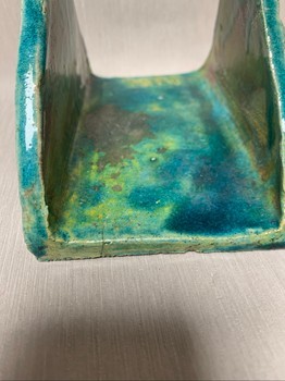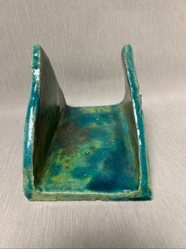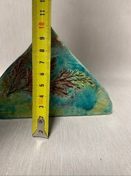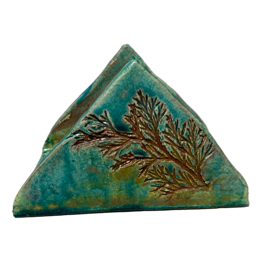 Käsitsi valmistatud türkiissinine keraamiline salvrätihoidja taimeornamendiga. Allkiri P.Willem '94.