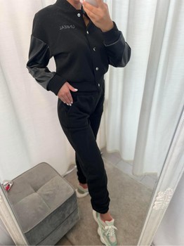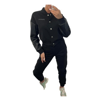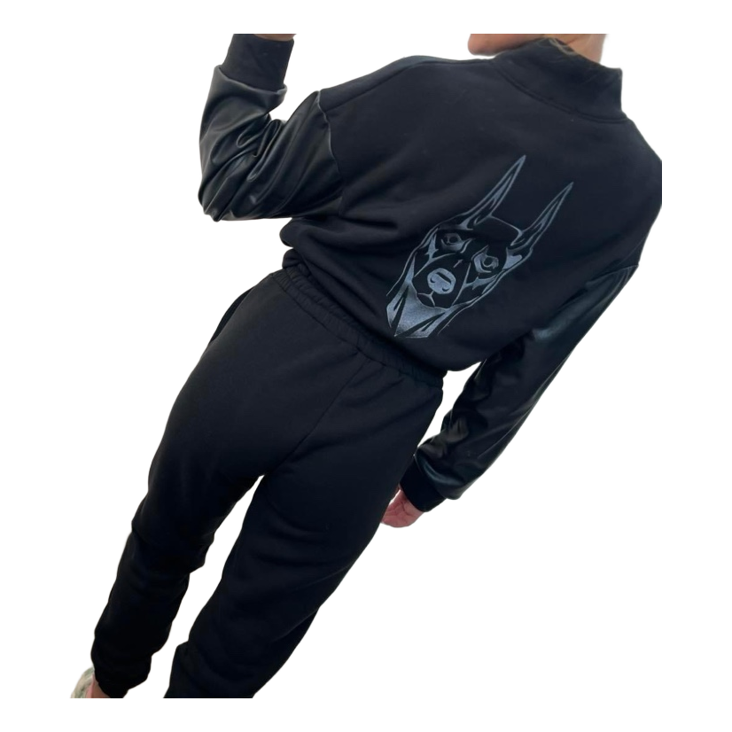 Black track suit with faux leather sleeves and snap button closure. Features a graphic print on the back.