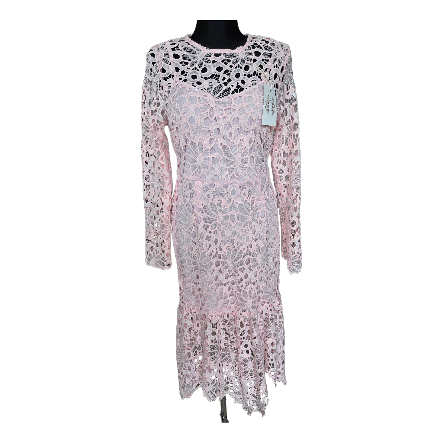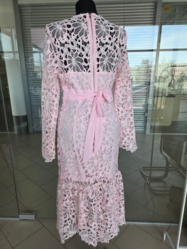 Lace midi dress in a light pink color. Features long sleeves, a back zipper, and a waist tie. Fully lined.