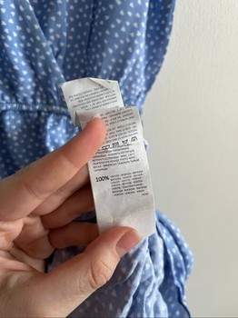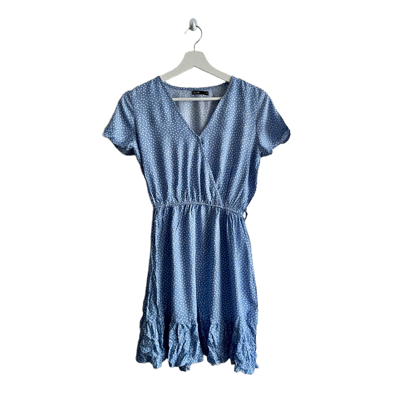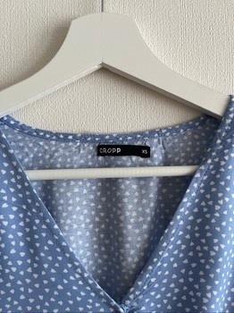 Short dress in light blue with white heart print. Features a v-neckline and elasticated waist. Size XS, made of 100% viscose.