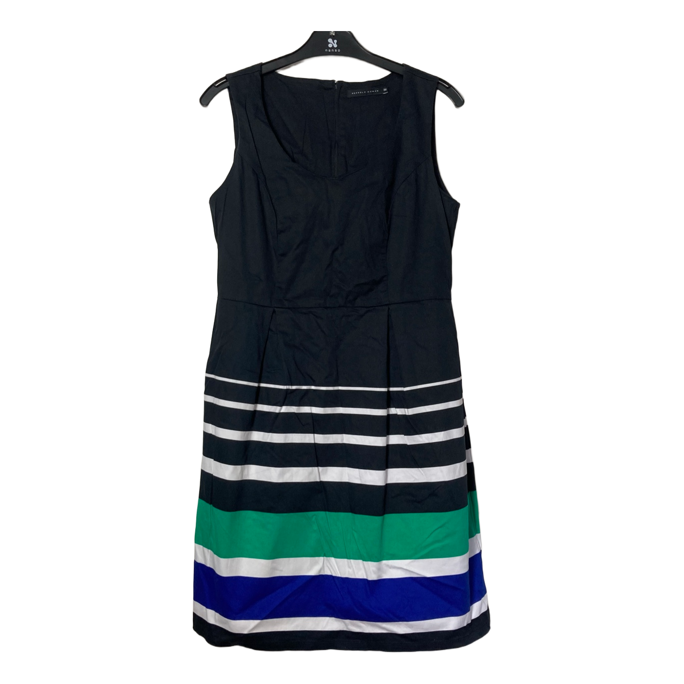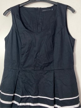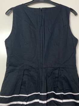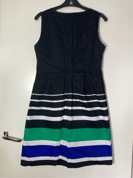 Seppälä stylish black sleeveless dress. Stripes in white, blue and green. Back zipper. Side pockets. Inverted pleats at the hem. Excellent condition. Tight cotton satin. 97% cotton and 3% elastane. Size 36. Underarm-to-underarm measurement about 48 cm. Waist circumference at the seam about 82 cm. Length about 93 cm.