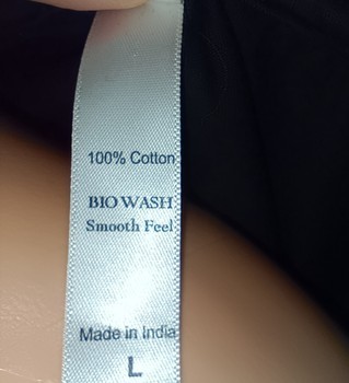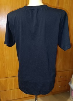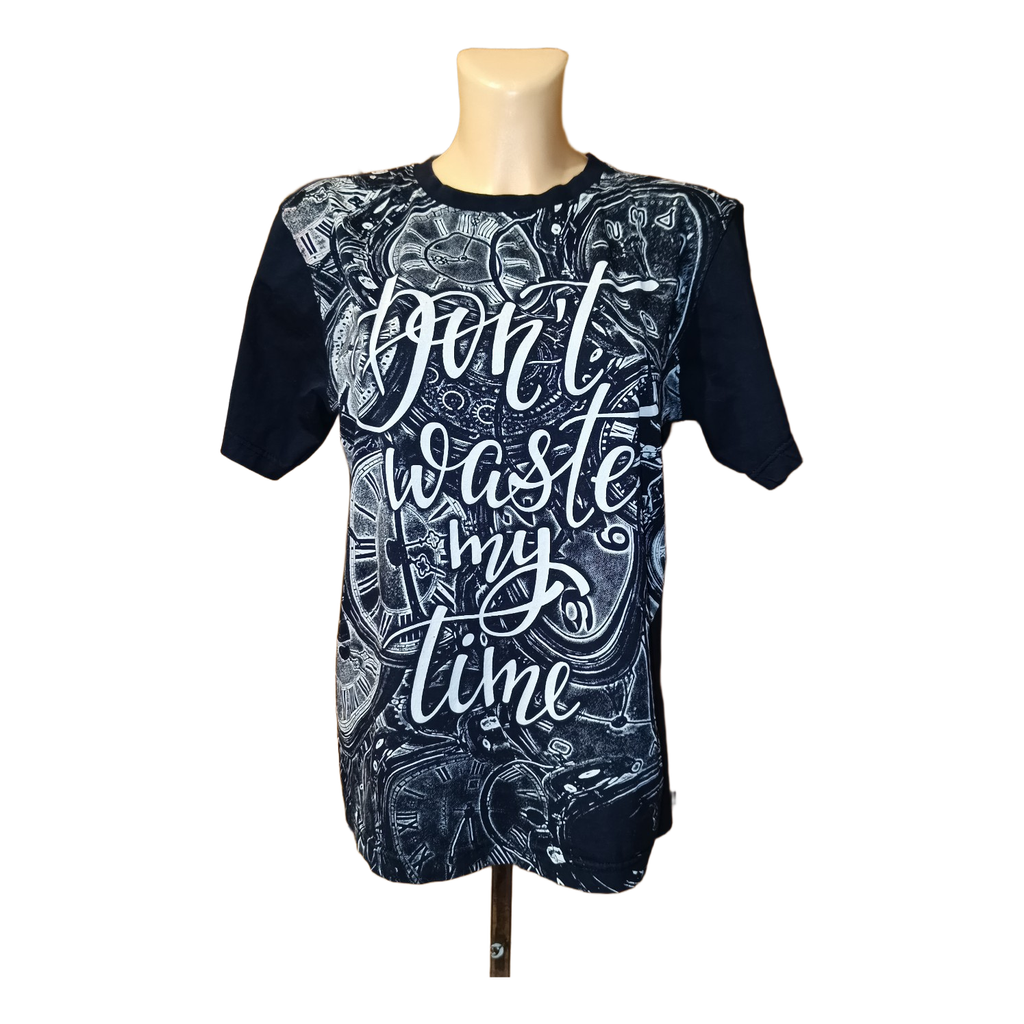 Black t-shirt with a graphic print on the front. Made of 100% cotton. Size M.