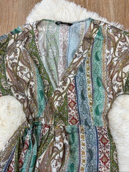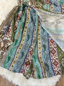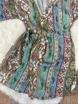 Short paisley print playsuit with a wrap-style front and tie belt. Size XS.