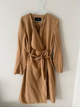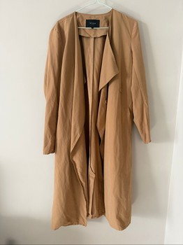 Beige trench coat with a belted waist and button details. Size L.