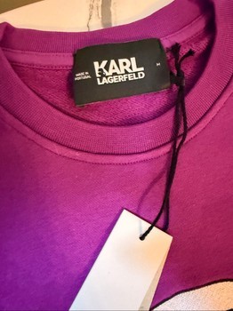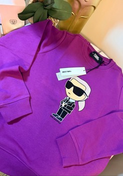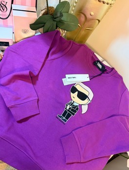 Purple sweatshirt with a Karl Lagerfeld character graphic. Long sleeves and ribbed edges, with original tags attached. Size M.
