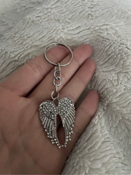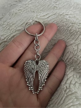 Unused silver-colored keyring with an angel wing pendant that has small clear stones.