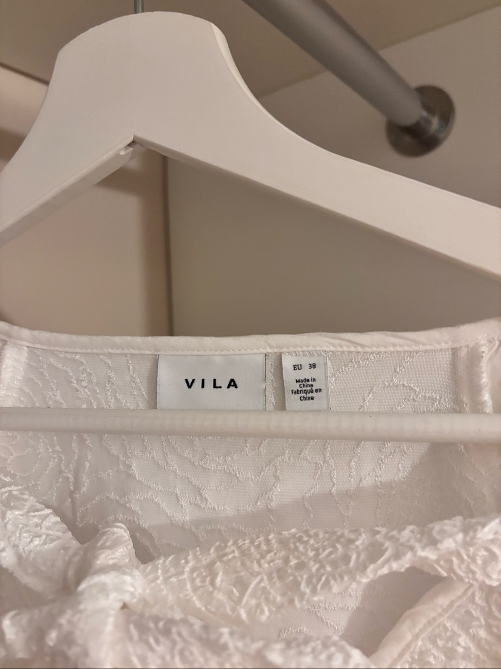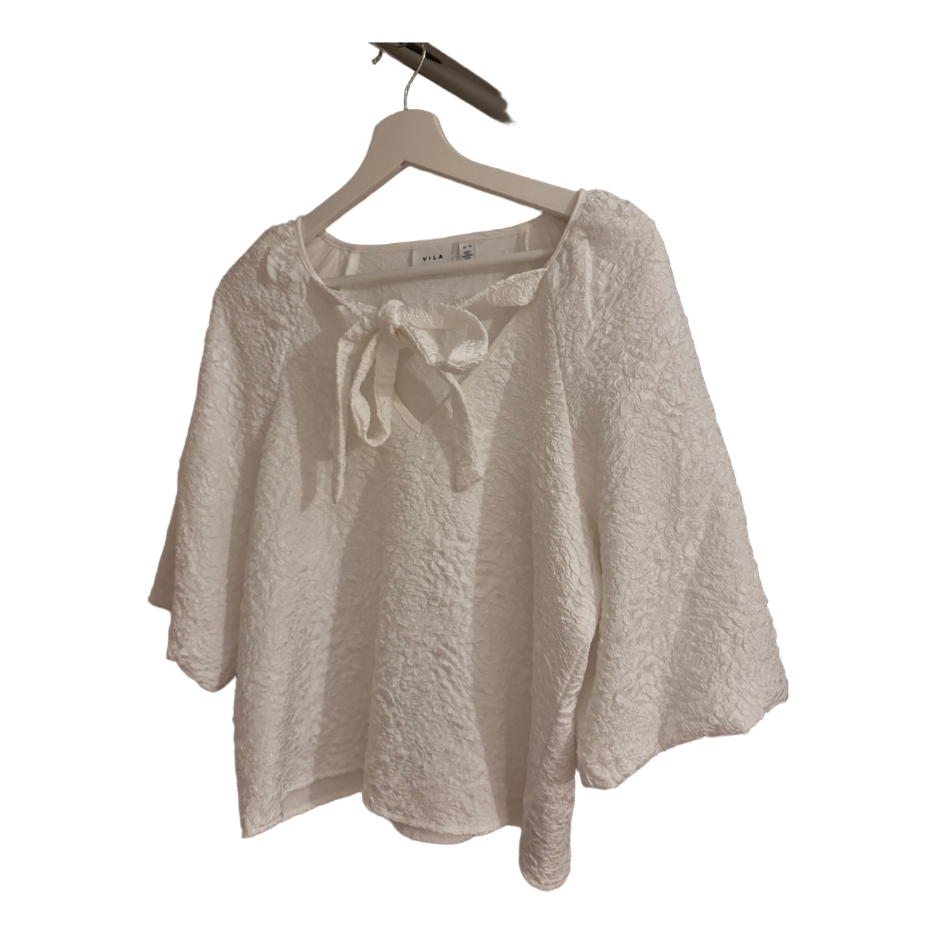 White blouse featuring a tie detail at the neckline and textured fabric. Size EU 38. VILA