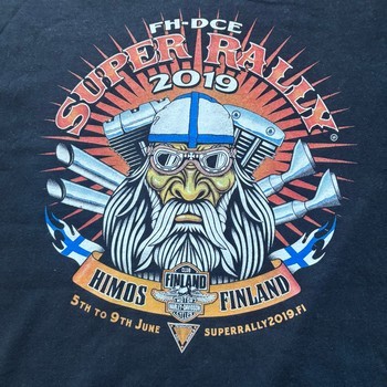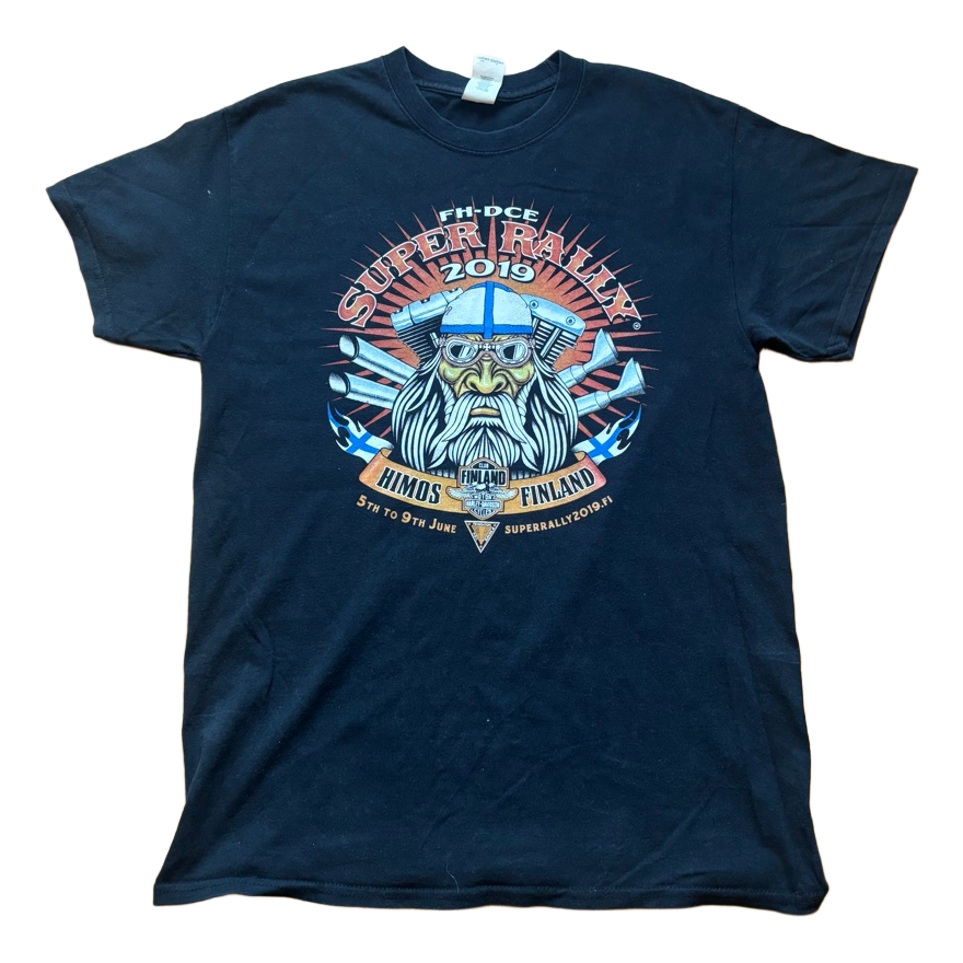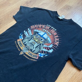 Black t-shirt featuring a Super Rally 2019 Himos Finland graphic on the chest. Made of cotton.