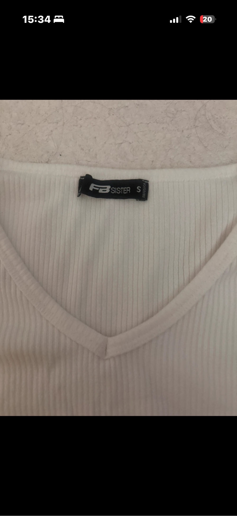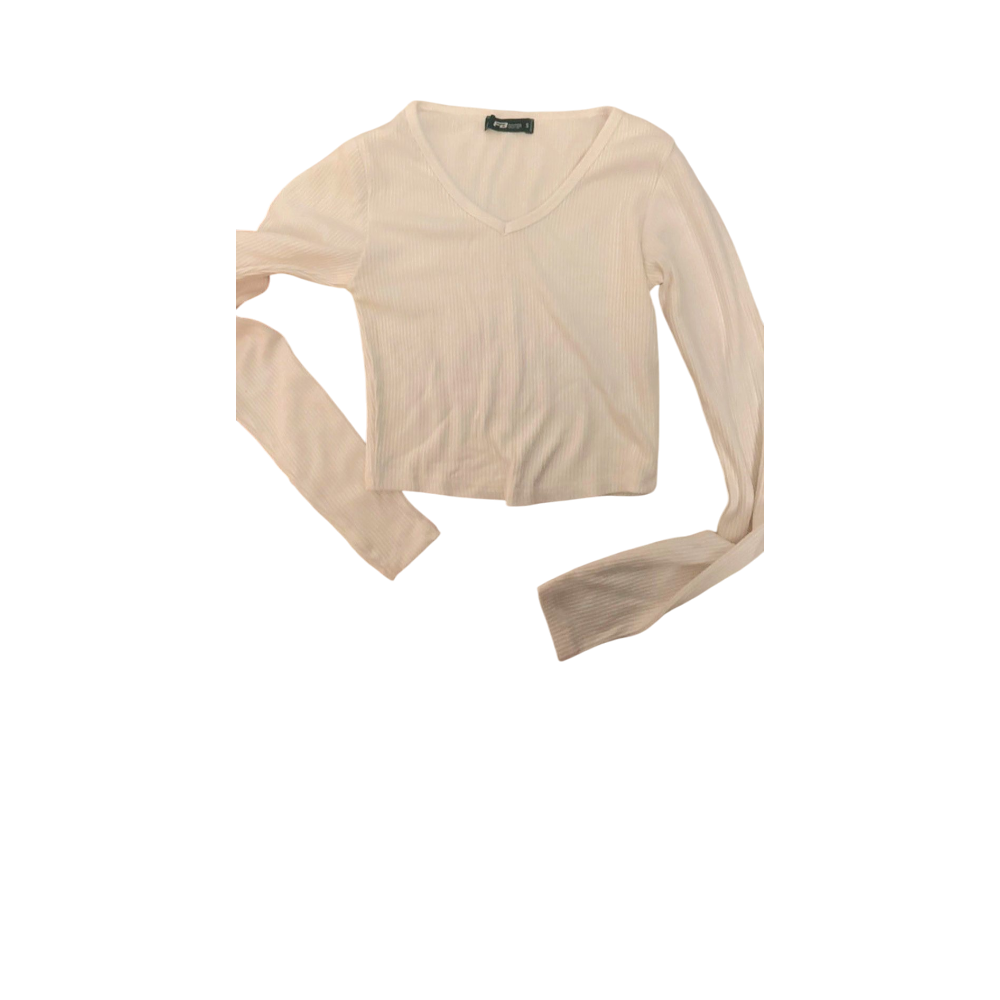 White ribbed long-sleeved top with a V-neck. It has a fitted silhouette.
