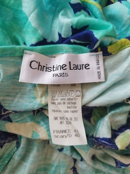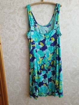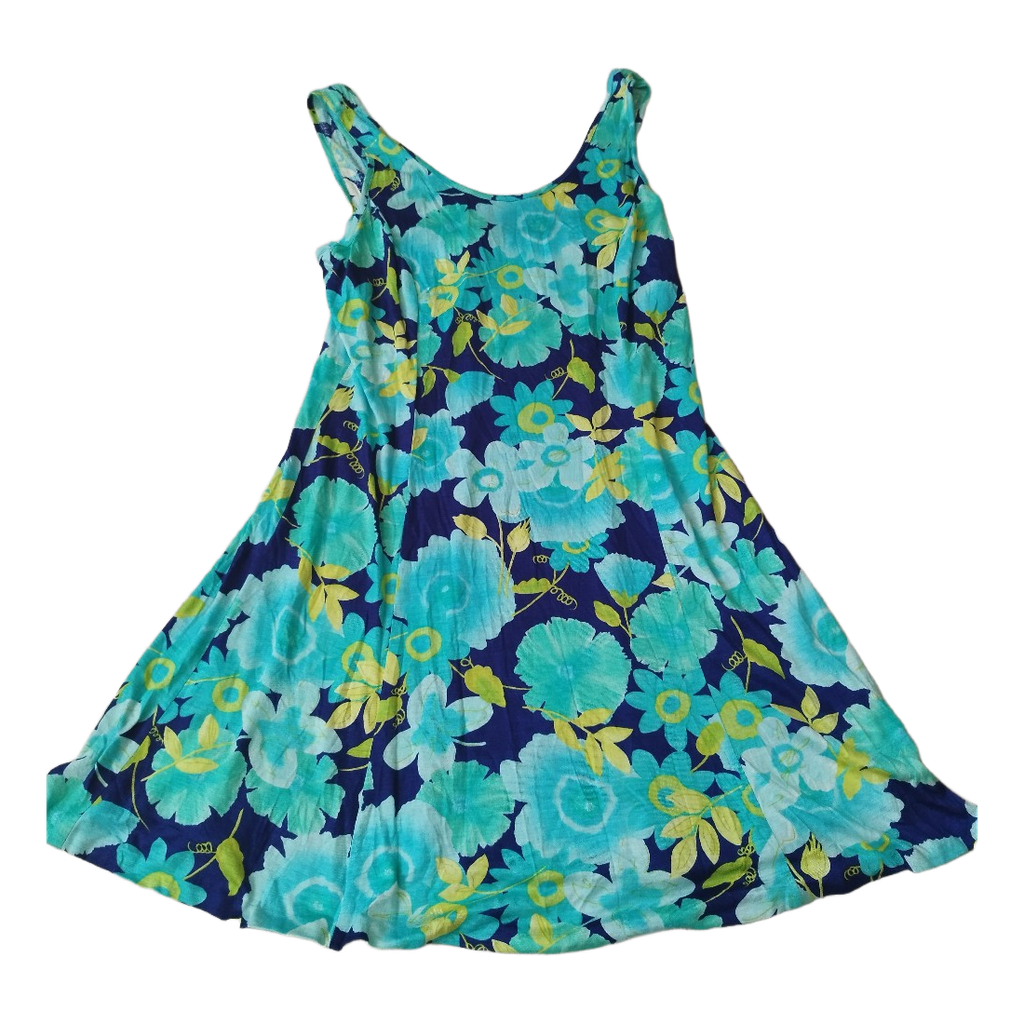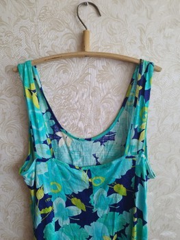 Sleeveless dress with a floral pattern in blue and green tones. Made from 100% viscose. Size 42.