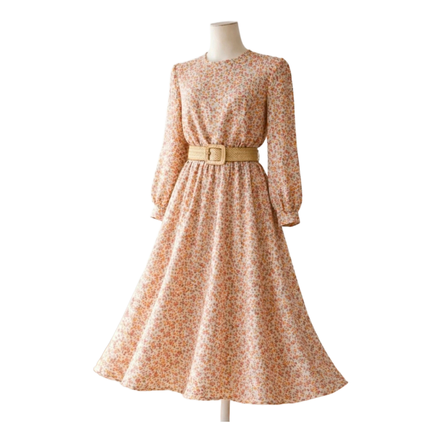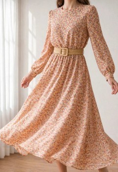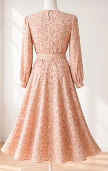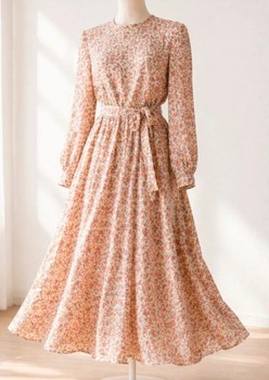Floral dress with long sleeves and a belt. Lightweight fabric. Custom tailoring. Bust 50. Waist 50. Hips 115*2. Sleeve length from armpit 38. Bottom width 185*2. Full length 126.
