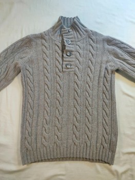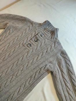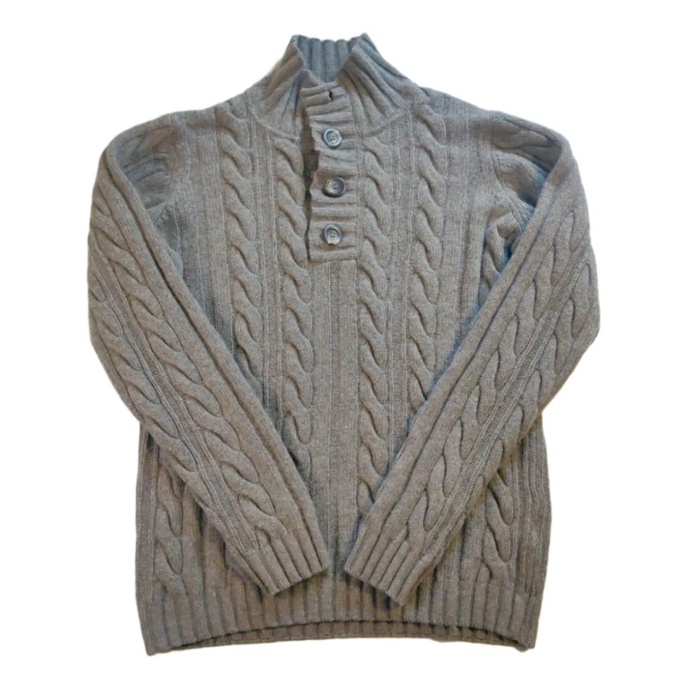 Classic grey cable knit sweater from the French Armand Thiery (AT Company) brand. The material is soft and warm lambswool blend (80% wool, 20% polyamide). The surface has a little pilling. The top button is missing. The sweater still looks good if you wear the collar slightly open. There was a small hole in the right sleeve that has been darned together. The repair is unobtrusive in use (see close-up photos on both sides). Size label M, but corresponds better to size S or a narrow M. See measurements. Pit-to-pit: 48 cm Shoulder-to-hem: 66 cm Pit-to-cuff: 51 cm