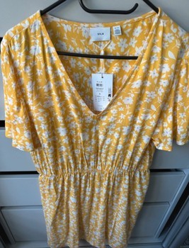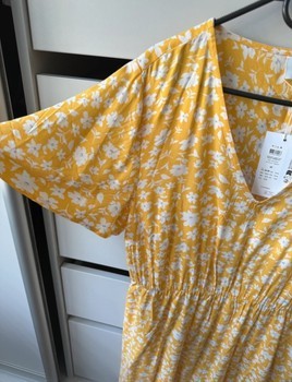 Short floral dress with V-neck, short sleeves and elastic waist. Made of viscose. New with tags.