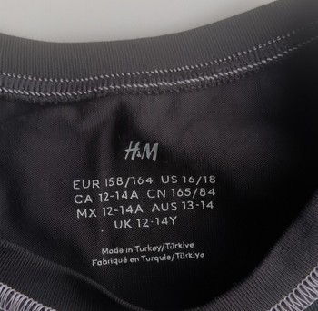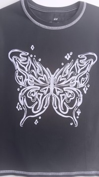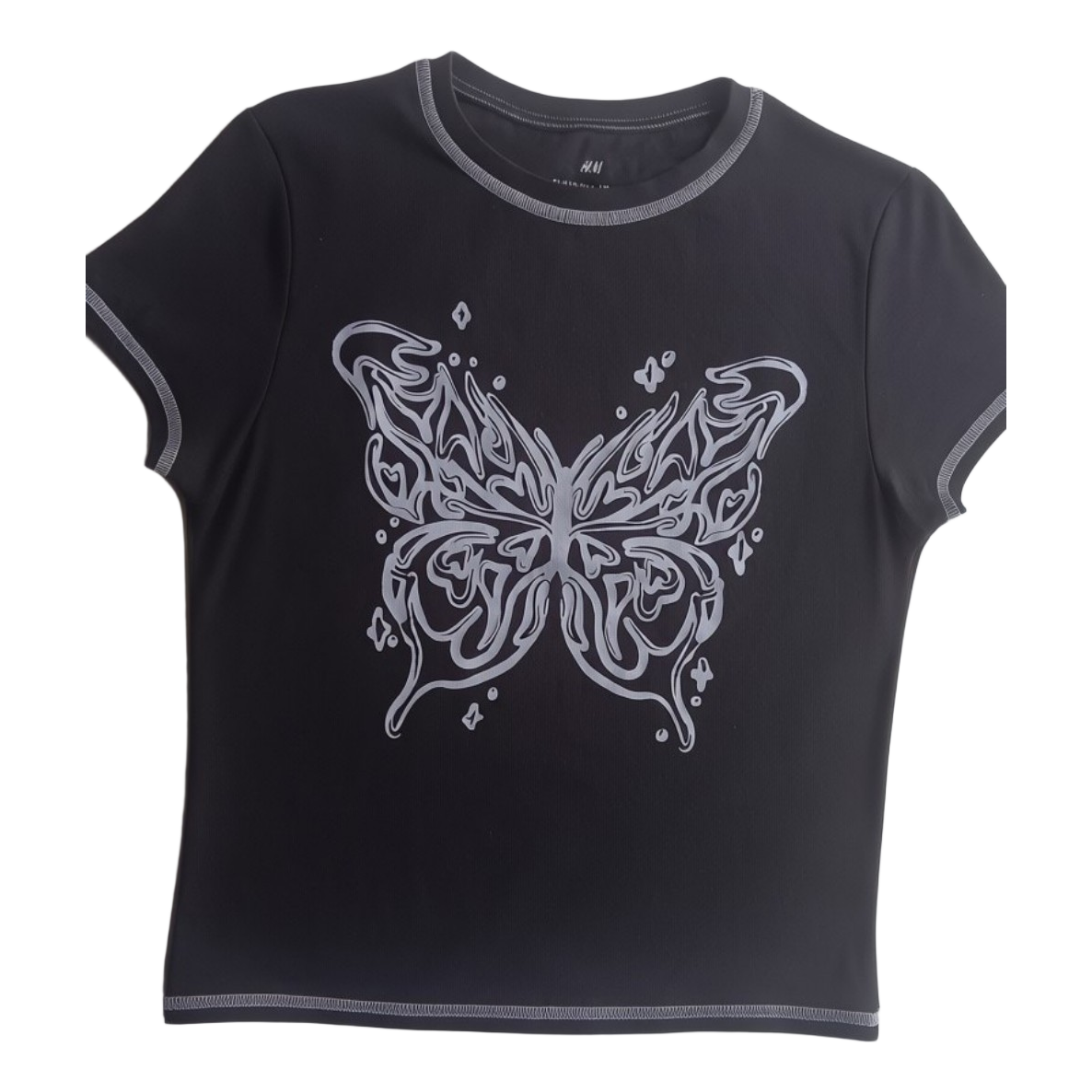 Black short-sleeved t-shirt with a white butterfly print on the front. Size 158/164, made of cotton and elastane.