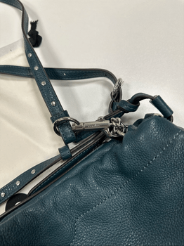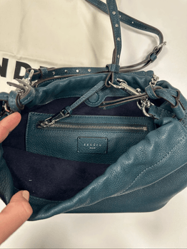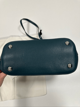 Stylish blue leather handbag. Features an adjustable strap and interior zip pocket. Includes original dust bag.