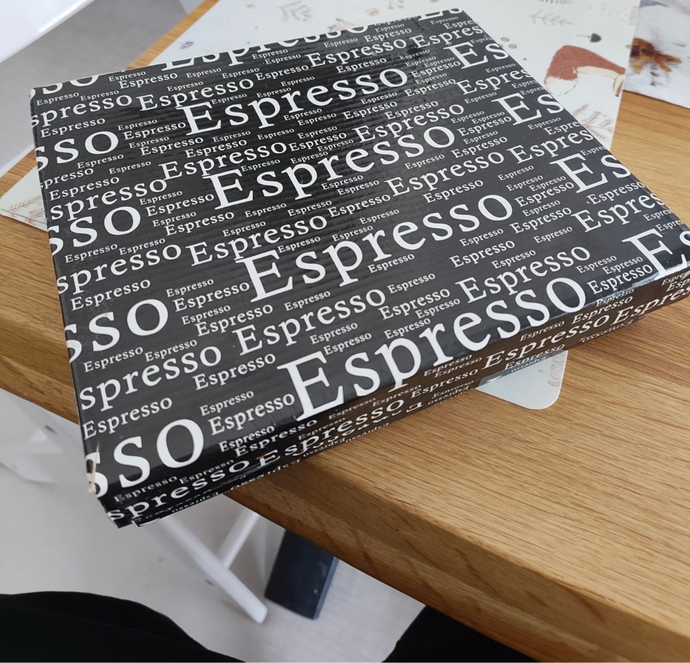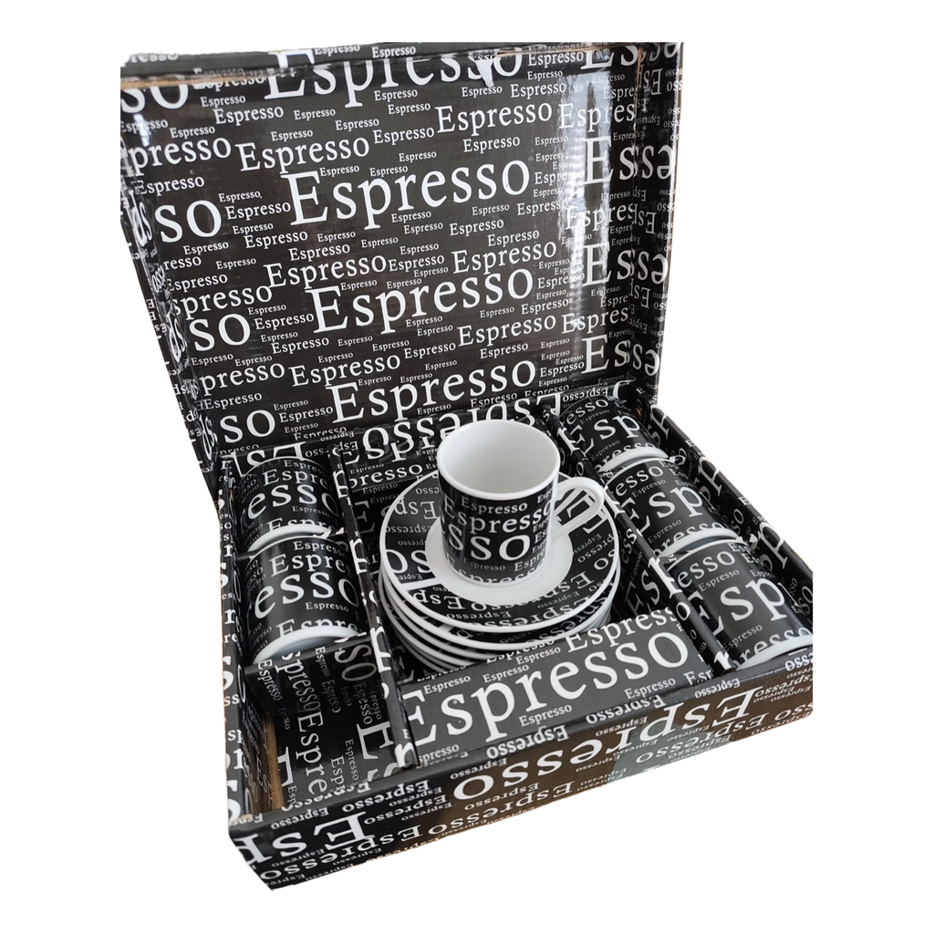 Black-and-white espresso cup set, with text all over. The set includes multiple cups and saucers in its own packaging.