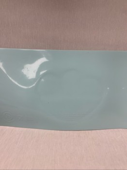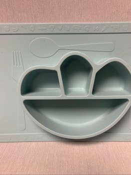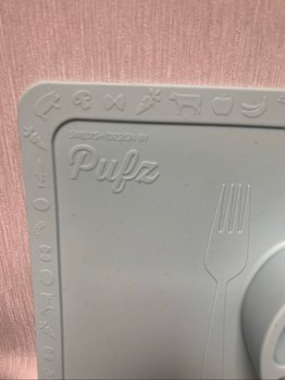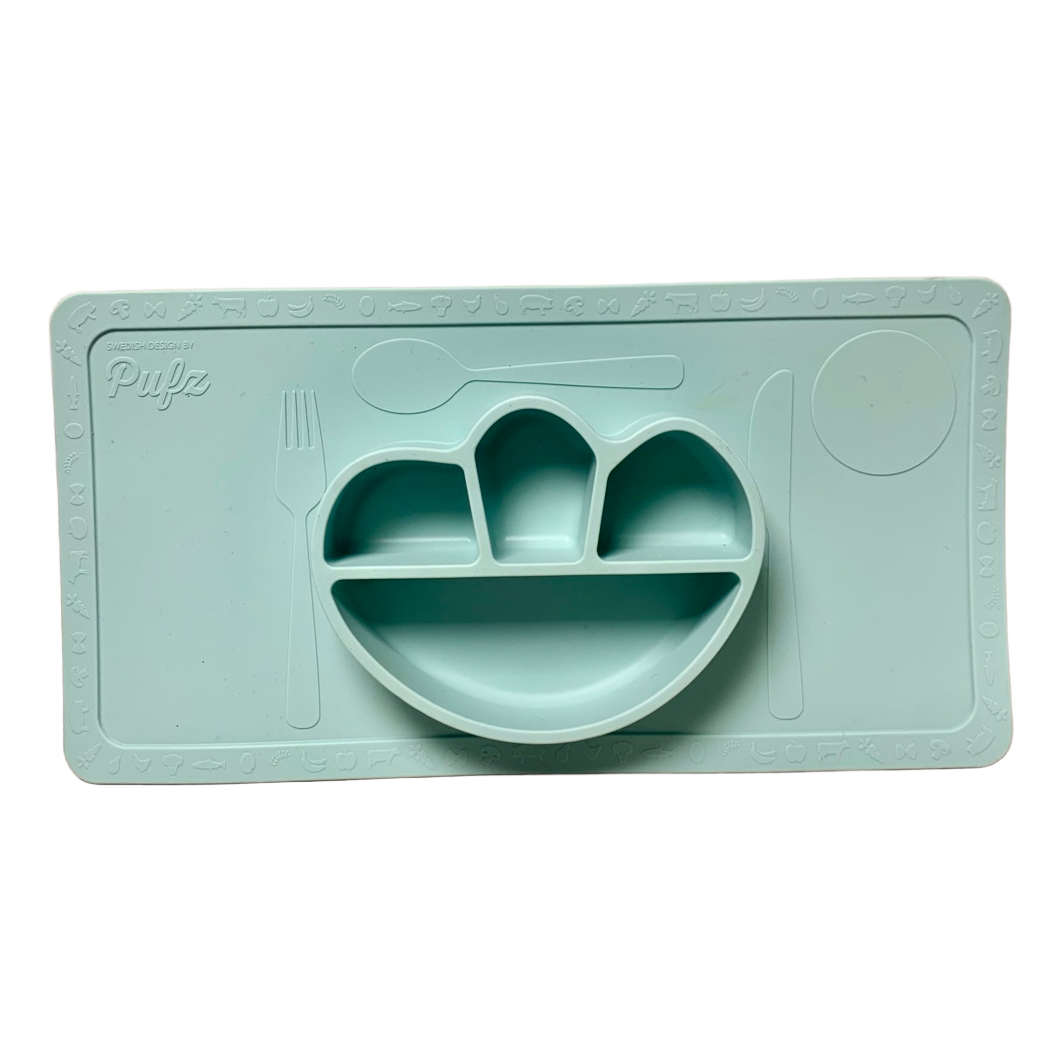 Light blue Pufz silicone placemat with integrated food compartments. Features decorative food icons along the edges.