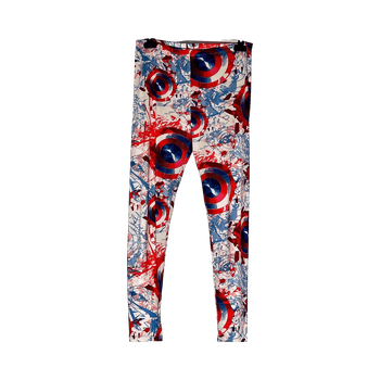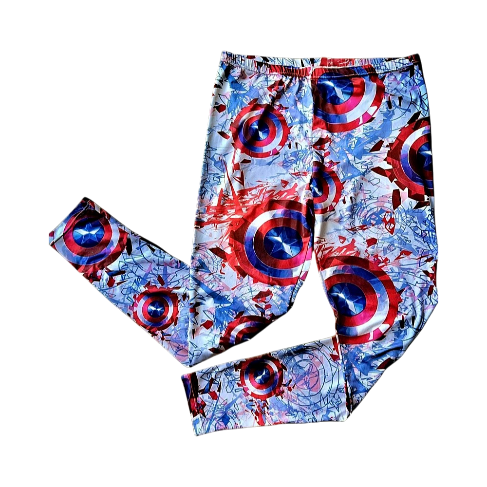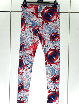 Marvel Captain America leggings. Worn a lot but still tidy (surface smooth, no pilling or fuzz) and intact although the stretch is no longer as firm as when new. Size tag marking faded, but are likely size L: waist width 41 cm (waist elastic quite loose), inseam length 78 cm. 95% polyester 5% elastane, wash 30C.