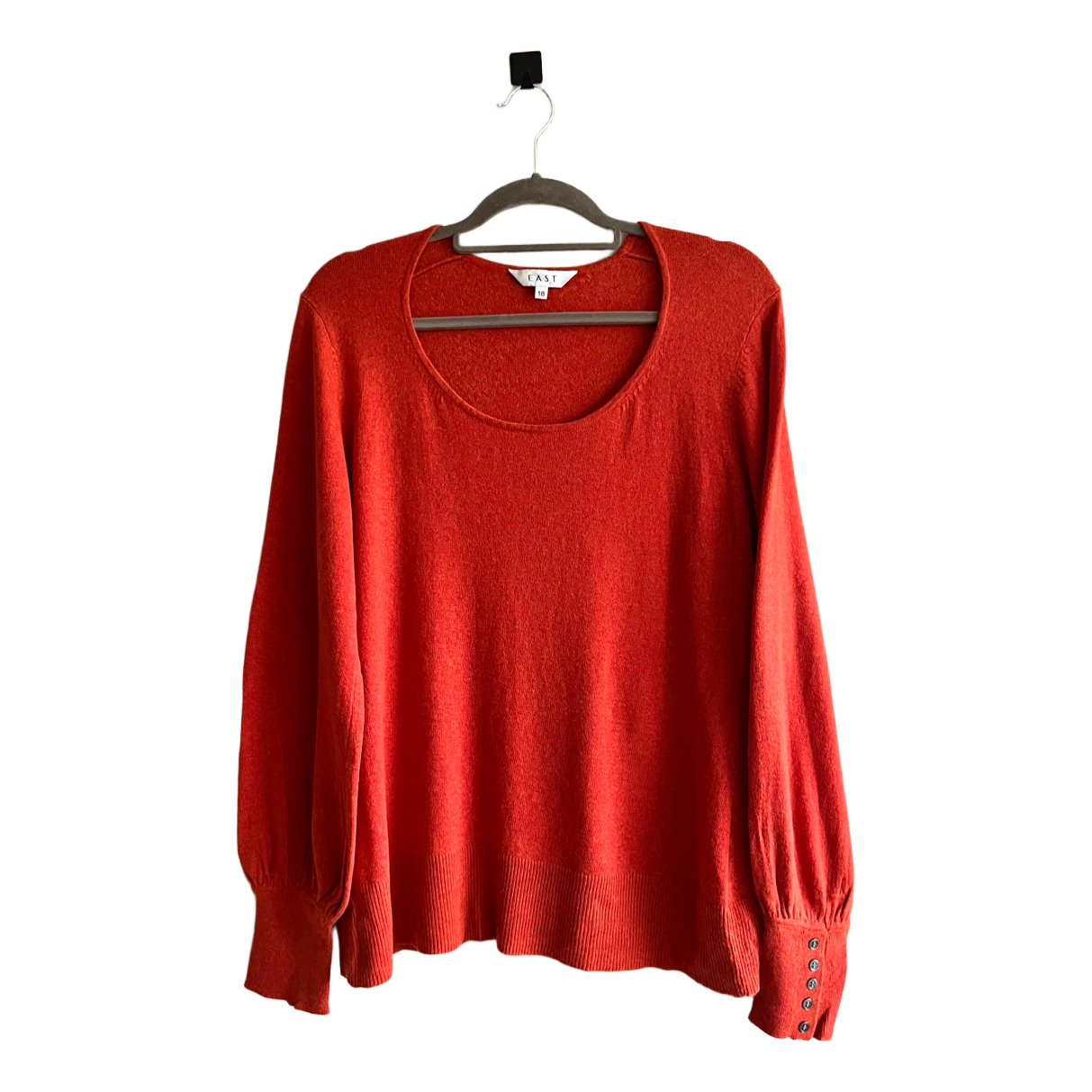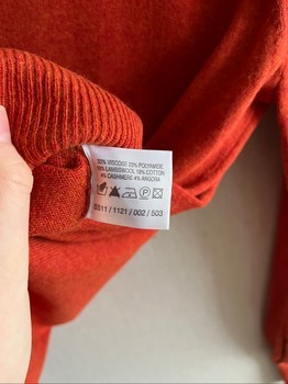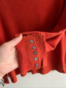 Red knit sweater with long sleeves and button detailing on the cuffs. Fill fit size XL best