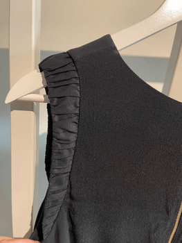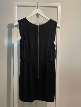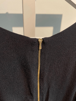 Silkkiä ja polyesteria, musta mekko. Röyhelöt olkapäillä. Takana kultainen vetoketju.