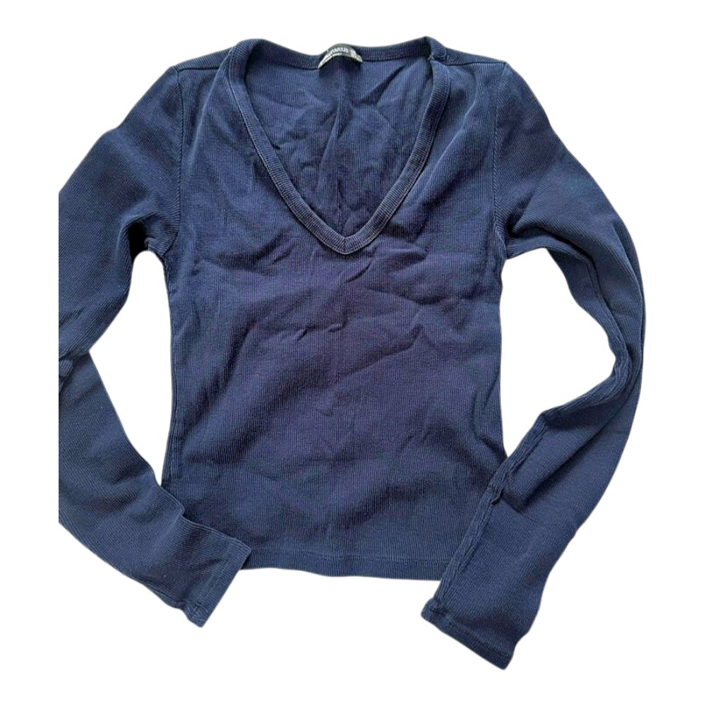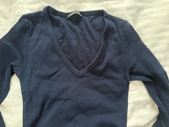 Navy blue long-sleeved top. Features a V-neckline and ribbed texture. Size S.