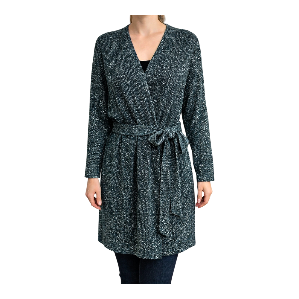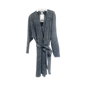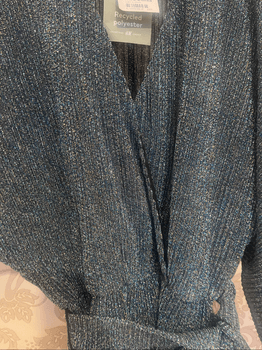Wrap dress featuring a belted waist and long sleeves. Made from recycled polyester with a textured finish.