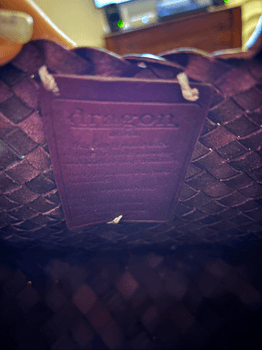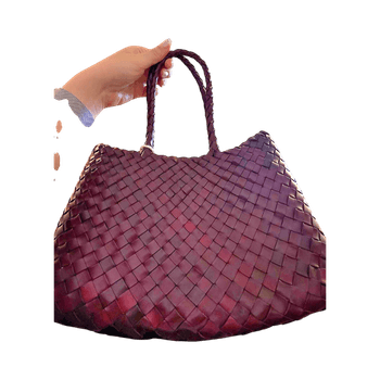 A woven leather bag featuring a burgundy color and braided handles. It includes an internal beige drawstring closure that purchased separately. Costs 45e