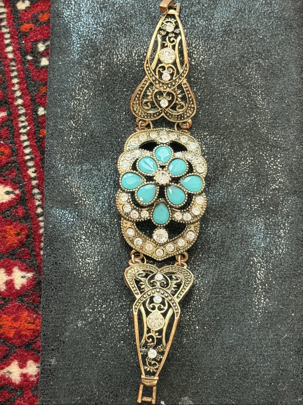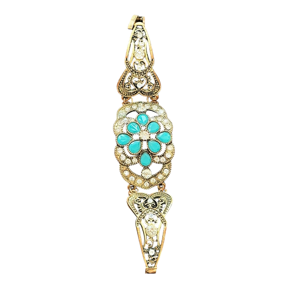 Ornate bracelet featuring turquoise floral accents and clear rhinestones in a gold-tone metal setting.