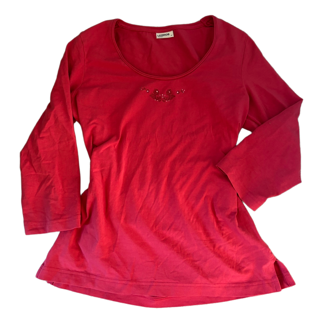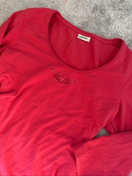 Red long-sleeved shirt decorated with neckline details. Fits XS-L. Y2k 2000s. Tise: _ria_. Vinted: pikkumyy112