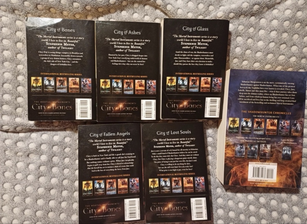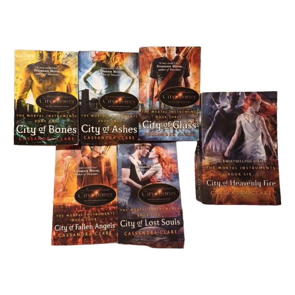 Set of six fantasy novels from The Mortal Instruments series by Cassandra Clare, including City of Bones through City of Heavenly Fire. The last book is bigger than the rest.