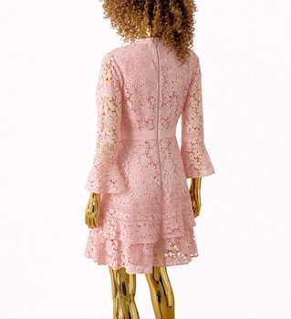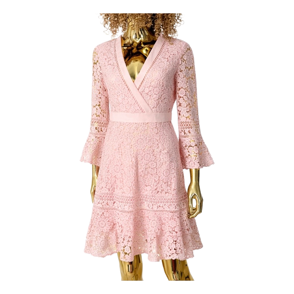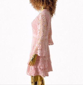 Light pink, layered lace dress. Long, flared sleeves and zipper at the back. Size 2.