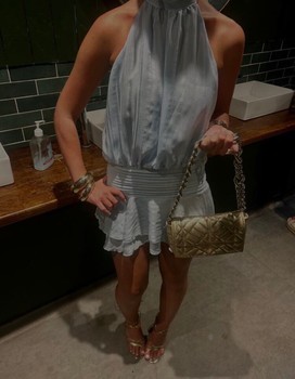 Halter neck mini dress in a light blue color. Features a pleated bodice and a tiered ruffle skirt with an open back design.