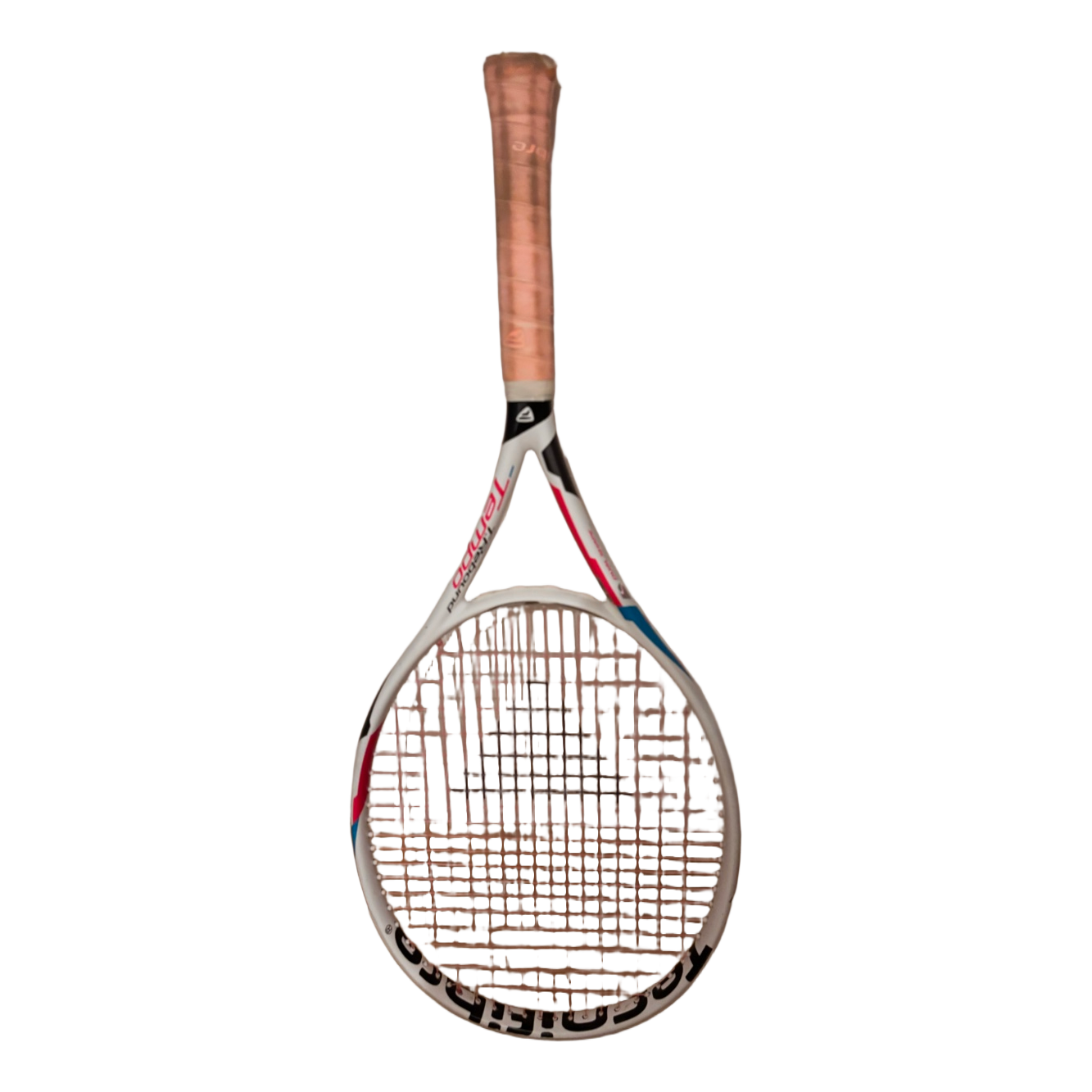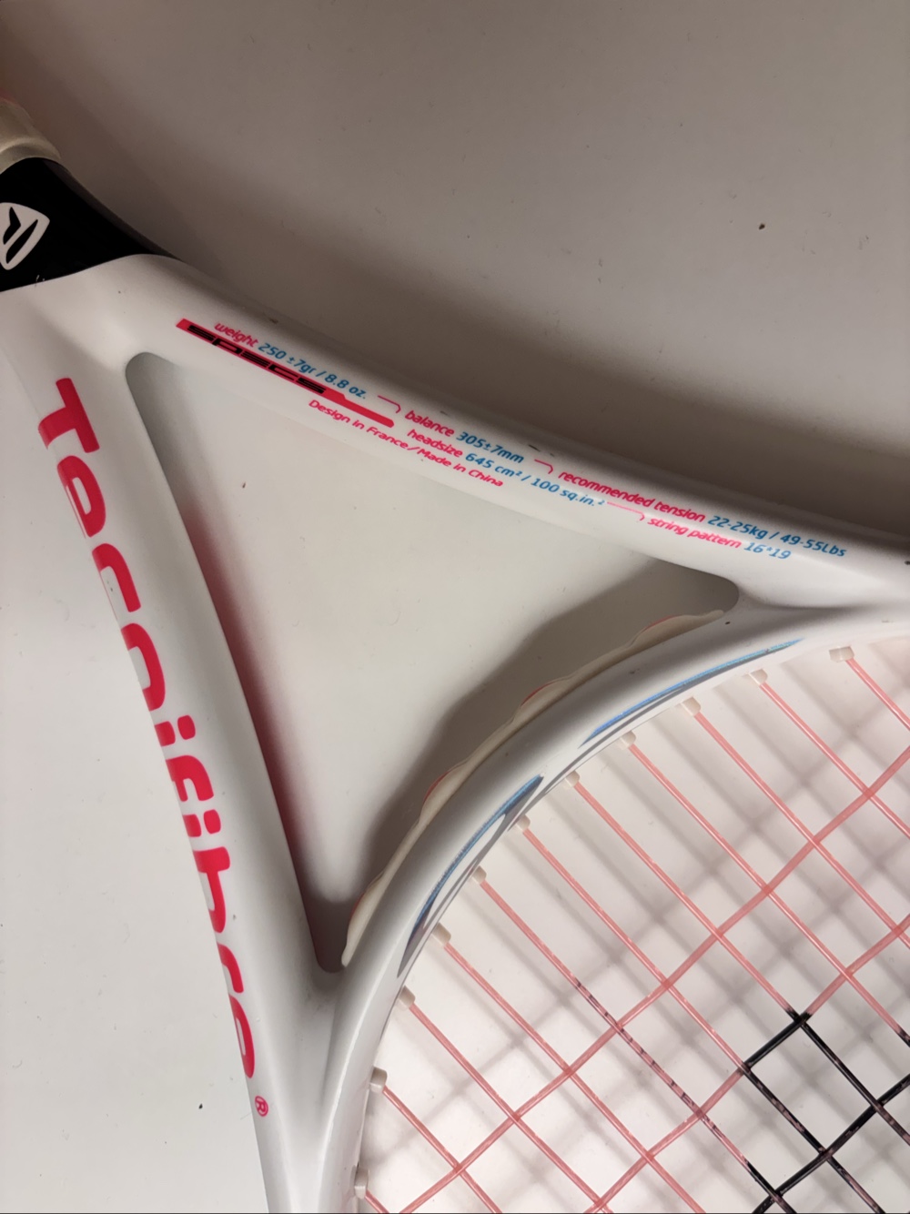 Tecnifibre Rebound tennis racket, white with pink and blue details. Features a 100 sq.in. head size and 250g weight.