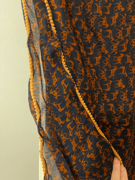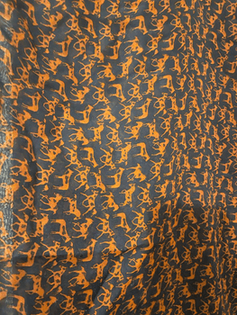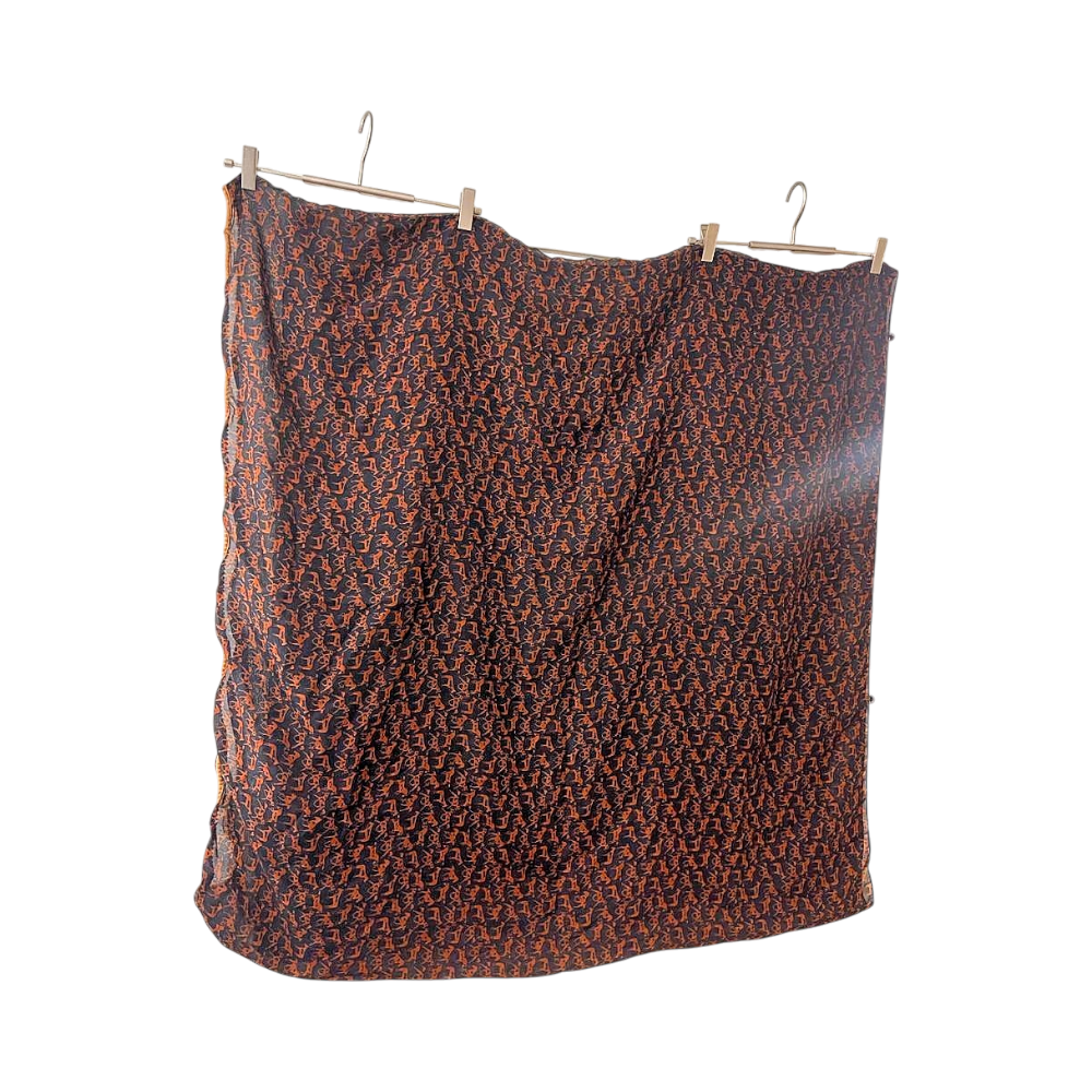 Patterned scarf with black and orange colors. Edges with pom-pom decoration. Tubular scarf, shown opened up in the picture.