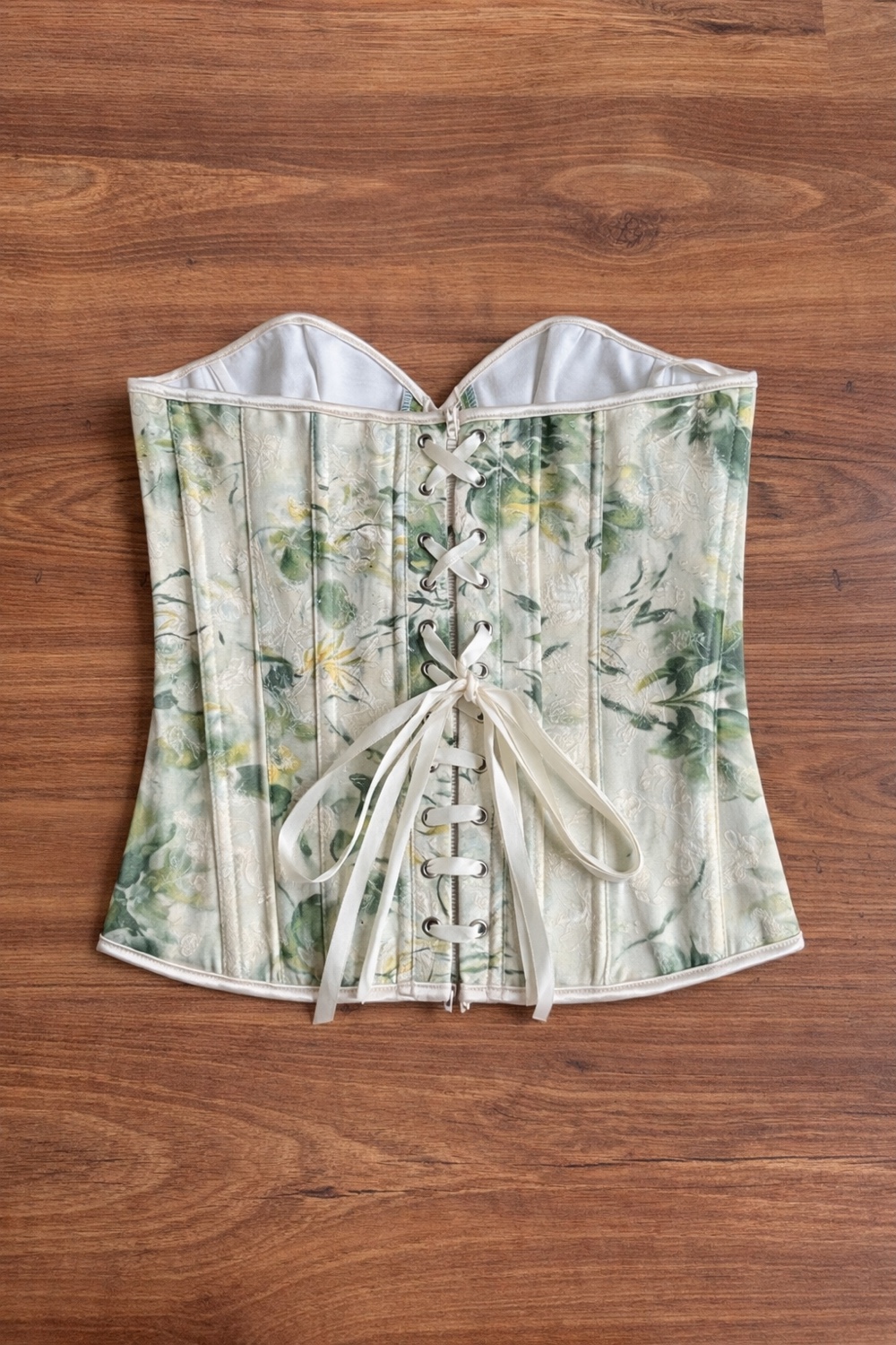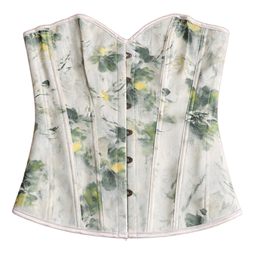 Floral print corset top with hook-and-eye front closure and lace-up back detail.