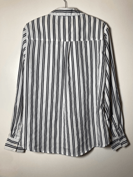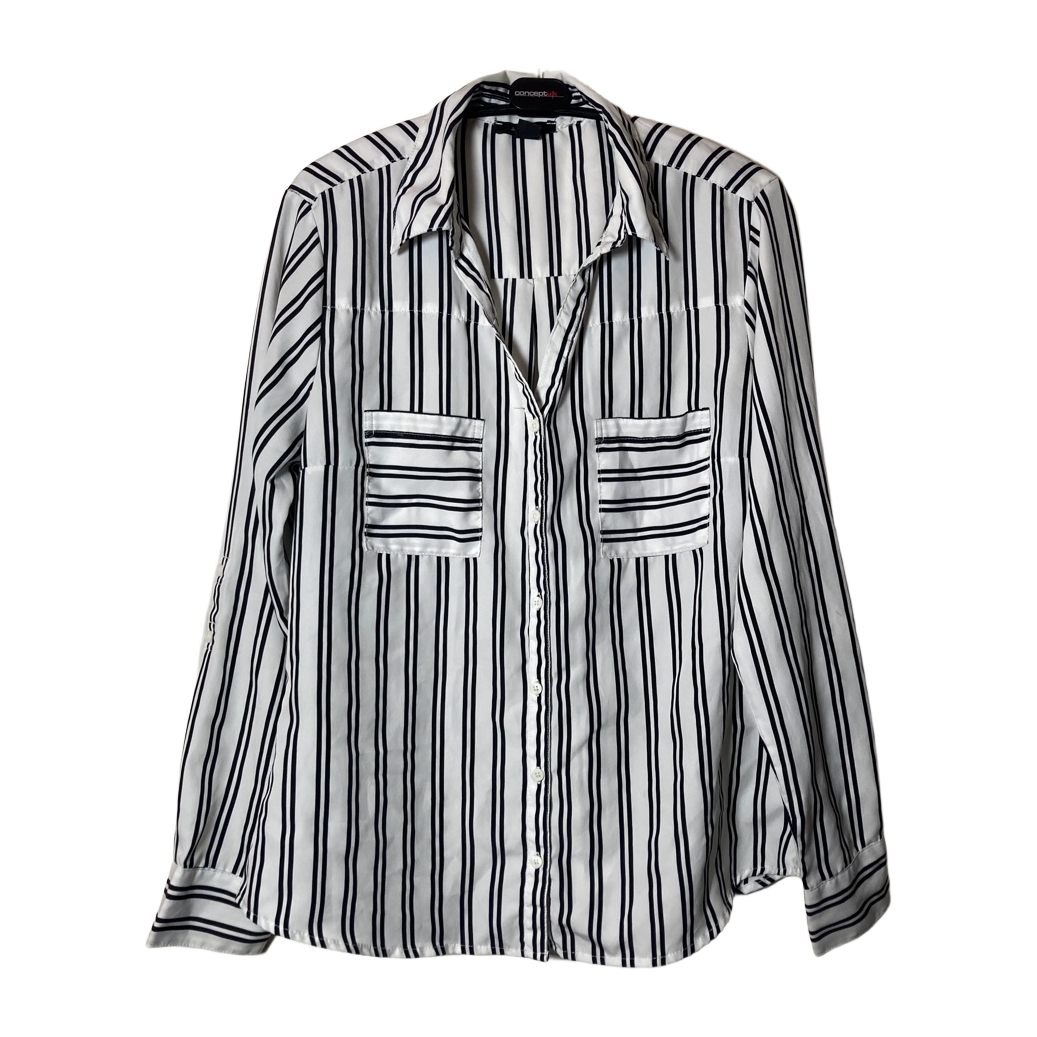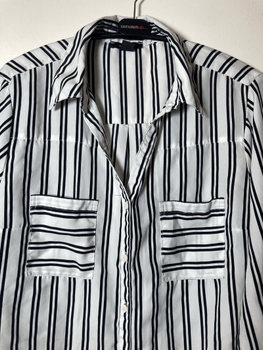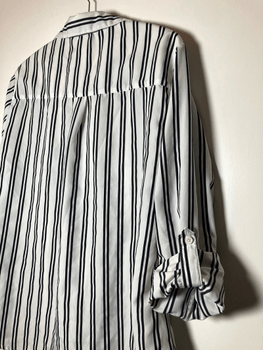 Amisu black-and-white striped button-up shirt. Shirt collar and V-neckline. Button placket starting from the height of the pockets. Two chest pockets. Cuffs on the sleeve ends with open vents and buttons. Sleeves can be rolled up and secured with a strap and buttons. Height can be adjusted. Curved hem and side slits. Longer hem at the back. Back yoke seam with box pleat. In excellent condition. Shoulder width about 43 cm. Circumference at armpit height about 107 cm. Pickup possible from Helsinki. Also for sale elsewhere.