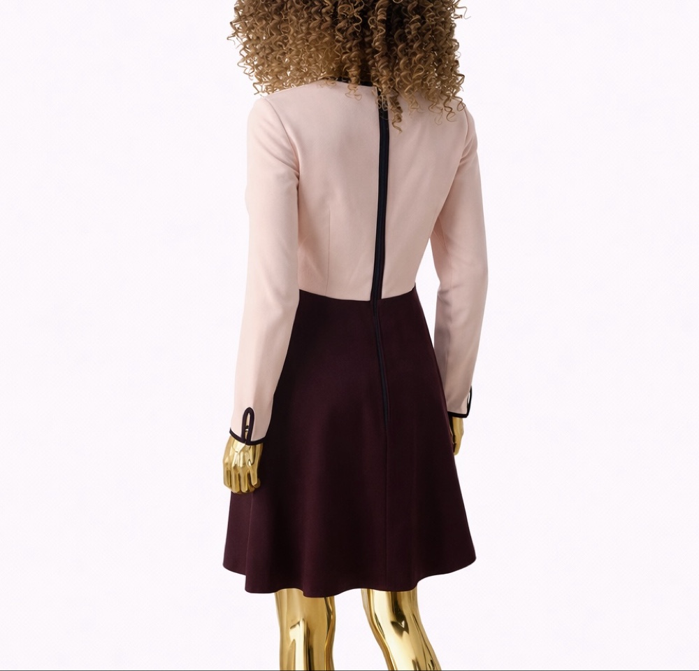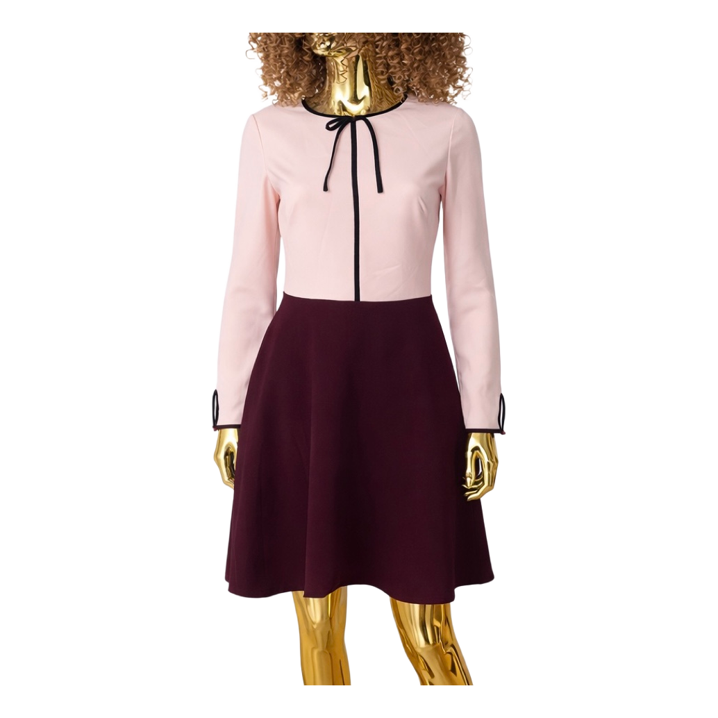 Two-coloured dress with a pink upper part and a wine-red skirt part. Long-sleeved style with black details. Size 2.