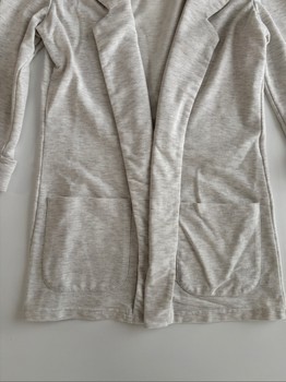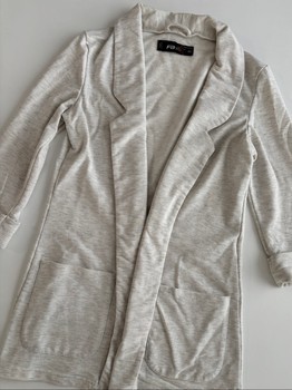 Women's blazer. Color light, white (off-white) base color with some gray shading. Soft fabric. 3/4 sleeves. Front pockets. Size XS. In my opinion corresponds to its size. Might also fit a small S. Used, but in excellent condition. Intact and clean. No complaints about condition.