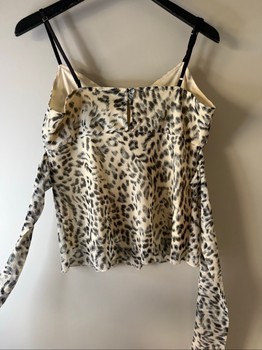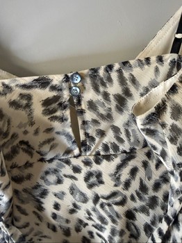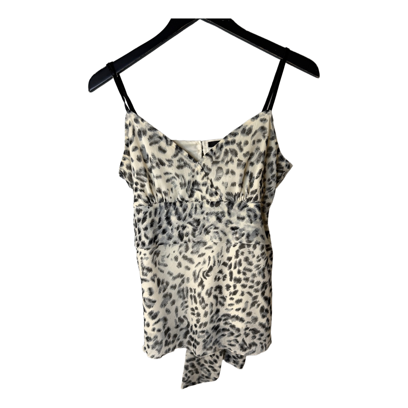 Leopard print camisole top with black straps and tie detail at the back. Button closure at the neckline. Size L.